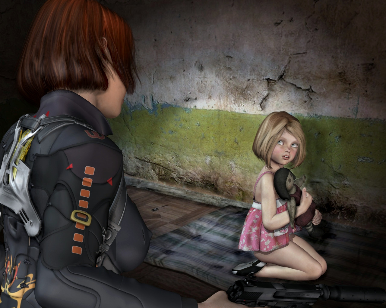 - Привет, ребенок, не бойся, я за тобой пришла, - она спрятала пистолет в кобуру и присела рядом.